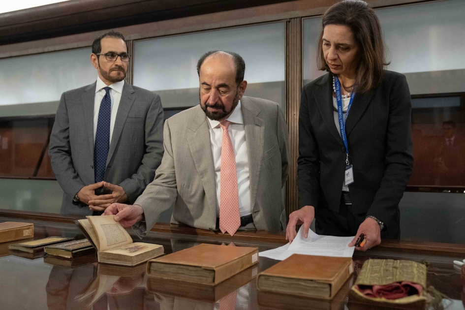رافق سموه كل من سعادة عمر عبيد الحصان سفير الدولة لدى جمهورية إيطاليا، وسعادة عبدالله بن محمد العويس رئيس دائرة الثقافة، وسعادة أحمد بن ركاض العامري رئيس هيئة الشارقة للكتاب، وسعادة الدكتور عبدالعزيز المسلم رئيس معهد الشارقة للتراث، وسعادة علي المري رئيس دارة الدكتور سلطان القاسمي، وسعادة عبدالله حسن الشامسي قنصل عام الدولة في ميلان، وسعادة محمد حسن خلف مدير عام هيئة الشارقة للإذاعة والتلفزيون، والدكتور عمرو عبدالحميد مدير أكاديمية الشارقة للبحوث.