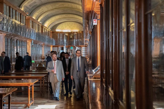 بعدها عرج سموه إلى المكتبة الملكية حيث قدم القائمون على المكتبة نبذة حول أبرز المحتويات التاريخية التي ضمت العديد من الكتب والمخطوطات والوثائق التاريخية التي توثق لعهد الحياة الملكية لعائلة الأمير سافوي.
