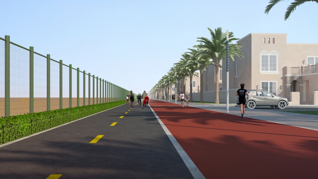 وسيحيط مسار الدراجات الهوائية الذي يمتد جنباً إلى جنب مع مضمار الجري، كلاهما على شكل دائري، بكامل المجتمع الذي يضم 1،500 فيلا، ويقع بمحاذاة شارع الشيخ محمد بن زايد، حيث من المتوقع إنجازهما أوائل العام القادم.