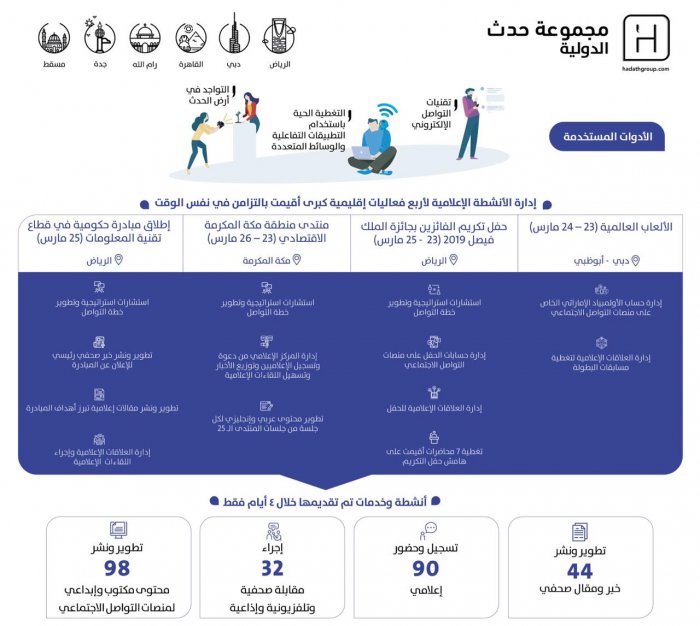 استحدثت شركة "حدث الدولية" الرائدة في حلول الاتصال الاستراتيجي، خطة عمل مبتكرة مكنتها من النجاح في تقديم خدمات التواصل الإعلامي لأربع فعاليات وأحداث رياضية واقتصادية وثقافية وتكنولوجية كبرى أقيمت جميعها بالتزامن في الفترة من 14 وحتى 26 مارس 2019 في أربعة مدن عربية مختلفة هي (الرياض ومكة ودبي وأبوظبي).