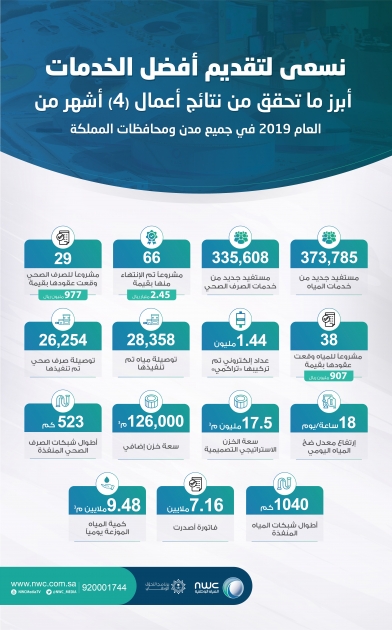 وأضاف أن نتائج الأربعة أشهر الماضية تضمنت انتهاء الشركة من تنفيذ 66 مشروعًا في مناطق المملكة المختلفة بتكلفة بلغت أكثر من 2,45 مليار ريال، وخدمة أكثر من 709 ألف مستفيد جديد من خدمات المياه والصرف الصحي في مناطق المملكة المختلفة.