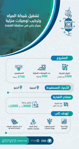 أعلنت شركة المياه الوطنية تشغيل شبكة المياه بمركز حلي في محافظة القنفذة. وأوضح مدير عام خدمات المياه بمحافظات منطقة مكة المكرمة المهندس عصام بن سالم الثبيتي، أن المشروع يتكون من شبكة مياه بطول (1000) متر طولي، وتوصيلات منزلية جديدة تخدم (600) عقار تخدم حيي الصفة والخيع، كما سيستفيد منها أكثر من 5700 نسمة، مبينًا أن مصدر التغذية هو من خط المياه من سد حلي، ومن المؤسسة العامة لتحلية المياه المالحة، فضلًا عن خزانين بسعة 3000 م3 و1000 م3.