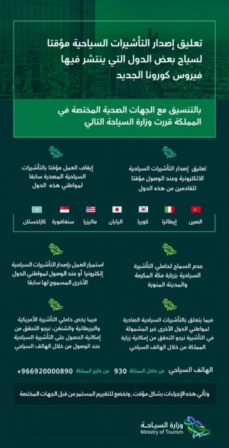 أكدت وزارة السياحة أنها وبالتنسيق مع الجهات الصحية المختصة في المملكة قررت تعليق إصدار التأشيرات السياحية الالكترونية وعند الوصول مؤقتا للقادمين من (الصين، إيطاليا، كوريا، اليابان، ، ماليزيا، سنغافورة، كازاخستان).