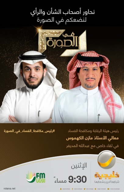 يحل معالي رئيس هيئة الرقابة ومكافحة الفساد الأستاذ مازن الكهموس، ضيفاً على حلقة هذا الأسبوع من برنامج "في الصورة"، الذي يعرض على شاشة روتانا خليجية غدًا الاثنين الساعة ٠٩:٣٠ مساءً.