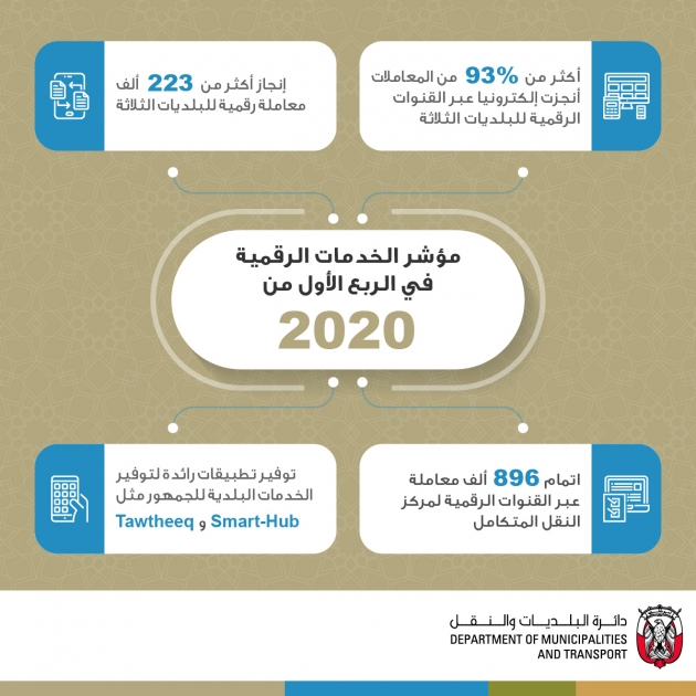 أعلنت دائرة البلديات والنقل والجهات التابعة لها عن إنجاز أكثر من 1.1 مليون معاملة عبر قنواتها الرقمية المتعددة خلال الربع الأول من العام الجاري ، تشكل ما نسبته حوالي 84% من إجمالي معاملاتها خلال هذه الفترة من العام.
