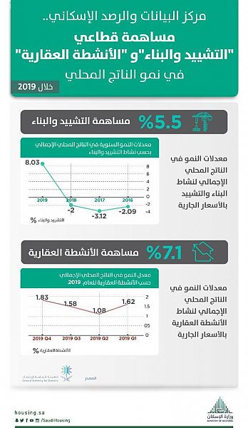 وكان القطاعان قد حققا نسبة إسهام في الناتج المحلي الإجمالي غير النفطي بالأسعار الثابتة بما يتجاوز 17% بنحو 9.3% لقطاع "الأنشطة العقارية"، ونحو 7.8% لقطاع التشييد والبناء خلال العام الماضي، ما أثر في زيادة عدد الوحدات السكنية في السوق وزيادة نسب التملك لنحو 62.08% حتى النصف الأول من 2019.