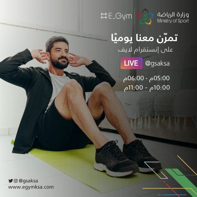 أطلقت وزارة الرياضة وبالتعاون مع الاتحاد السعودي للإعلام الرياضي، اليوم الأحد 17 رمضان 1441هـ  الموافق 10 مايو 2020م مُبادرة جديدة تحمل عنوان "E_Gym" تهدف إلى تحفيز المجتمع لممارسة مختلف أنواع التمارين الرياضية عبر بوابة رقمية من شأنها إتاحة الفرصة للجميع لممارسة الأنشطة الرياضية رقميًا مع مدربين محترفين، وذلك بالتزامن مع قرارات المملكة لتشجيع البقاء في المنازل وتجنب التجمعات الخارجية.