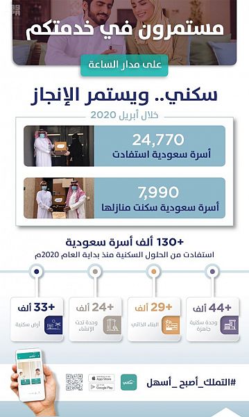 يُذكر أن برنامج "سكني" أعلن عن استفادة أكثر من 300 ألف أسرة في جميع مناطق المملكة خلال العام الماضي 2019م من مختلف الخيارات السكنية والتمويلية، بينها أكثر من 109 آلاف أسرة سكنت منازلها، ويستهدف البرنامج في 2020 خدمة 300 ألف أسرة جديدة لتمكينهم من امتلاك المسكن الملائم ضمن خيارات متعددة، تحقيقاً لمستهدفات برنامج الإسكان - أحد برامج رؤية المملكة 2030 - لرفع نسبة التملك إلى 70% بحلول عام 2030.