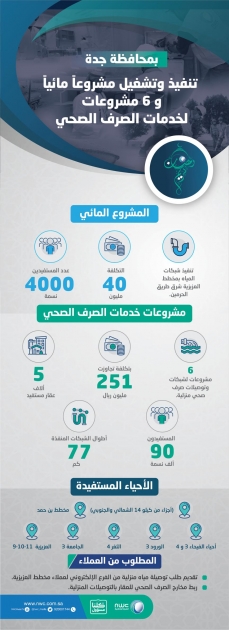 أعلنت شركة المياه الوطنية الانتهاء من تنفيذ 7 مشاريع بيئية ومائية جديدة بمحافظة جدة وتشغيلها بتكلفة إجمالية بلغت 291 مليون ريال، وذلك لخدمة أهالي المحافظة. وتضمنت 6 مشاريع جديدة لإيصال خدمة شبكات الصرف الصحي والتوصيلات المنزلية إلى العقارات بأحياء كيلو 14 الشمالي والجنوبي ومخطط بن حمد بطريق مكة القديم، وأحياء الفيحاء (3) والفيحاء (4) والورود (3) والثغر(4) والجامعة(3)، بالإضافة إلى أحياء العزيزية (11،10،9)، حيث تم إيصال الخدمة وربط أكثر من 5000 عقار بالشبكة العامة بتلك الأحياء، إضافة إلى مشروع واحد لتنفيذ شبكات مياه الشرب بمخطط العزيزية شرق طريق الحرمين لخدمة 4000 نسمة.