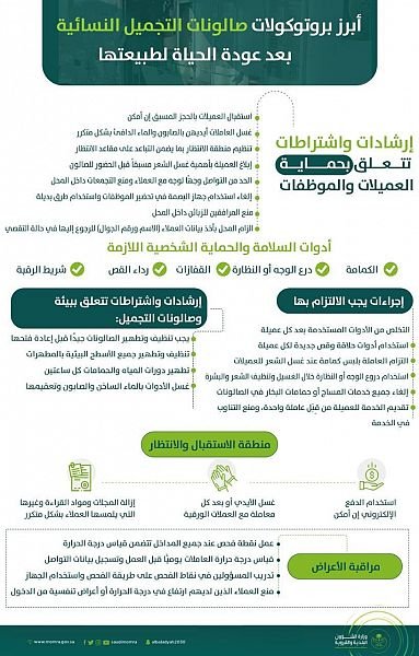 وتضمنت "البروتوكولات" إرشادات واشتراطات تتعلق بحماية العميلات والموظفات وتشمل استقبال العميلات بالحجز المسبق -إن أمكن- وغسل العاملات أيديهن بالصابون والماء الدافئ بشكل متكرر، وتنظيم منطقة الانتظار بما يضمن التباعد على مقاعد الانتظار، وإبلاغ العميلة بأهمية غسل الشعر مسبقاً قبل الحضور للصالون.