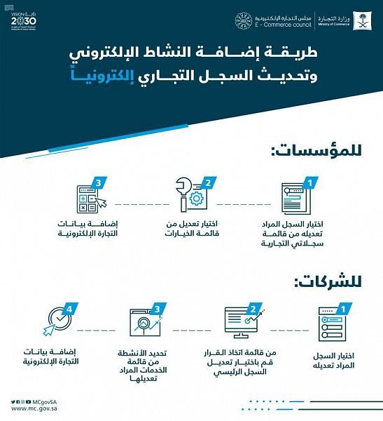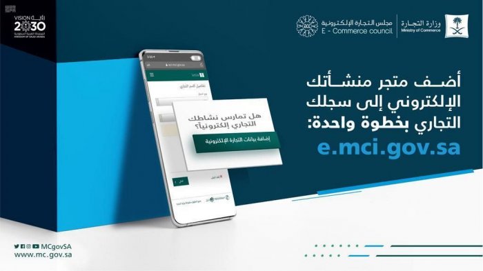 دعت وزارة التجارة عموم الشركات والمؤسسات المزاولة لأنشطة التجارة الإلكترونية إلى إضافة بيانات متاجرها الإلكترونية من خلال خدمة تحديث بيانات السجلات التجارية عبر الرابط: e.mci.gov.sa وذلك تطبيقاً لما نص عليه نظام التجارة الإلكترونية ولائحته التنفيذية.
