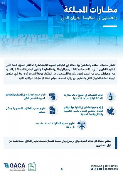 كما تقوم هيئة الطيران المدني بتوفير المعقمات في جميع أرجاء مطارات المملكة البالغ عددها 28 مطاراً ، وتلزم جميع العاملين في المطارات والطواقم الجوية بالفحص الطبي، وتعقيم اليدين ولبس الكمامة والقفاز وأقنعة الحماية ، إضافة إلى تطهير جميع المطارات بشكل مستمر ، وتطهير جميع الطائرات المستخدمة بعد كل رحلة.