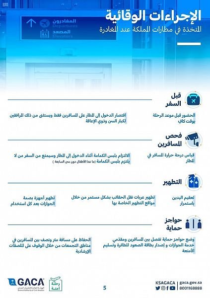 ويأتي هذا التحديث علاوة على البروتوكولات السابقة المطبقة سابقا ، ومن أبرزها شراء تذاكر الطيران عبر الوسائل الإلكترونية فقط ، والحضور قبل مواعيد إقلاع الرحلة بوقت كافٍ ، وقياس درجة حرارة المسافر في المطار ، حيث لن يسمح بالسفر لمن تزيد درجة حرارته عن (38) درجة مئوية ، إضافة إلى تعقيم اليدين عند الدخول إلى الصالة ، ولبس الكمامة القماشية أو غيرها أثناء الدخول إلى المطار "يمنع من السفر من لا يلتزم بلبس الكمامة" ، وارتداء الكمّامات والقفازات طوال مدة سير الرحلة وأثناء عملية النزول من الطائرة ، والالتزام بالإفصاح الطبي خلال مرحلة الحجز، والإبلاغ في حال وجود أي أعراض لمرض كورونا ، ويسمح لكل مسافر بحمل قطعة واحدة فقط من الأمتعة الشخصية داخل مقصورة الطائرة ، وتشجيع استخدام وسائل الدفع الإلكترونية والتقليل من استخدام الأوراق النقدية ، إضافة إلى تجنب الاصطفاف المتقارب في مرحلة الصعود إلى الطائرة وداخل حافلات النقل وجسور الإركاب ، والحفاظ على التباعد الجسدي والاجتماعي بين المسافرين في جميع مراحل السفر وعند مقدمي الخدمات ، وذلك من خلال الوقوف على الملصقات الإرشادية.