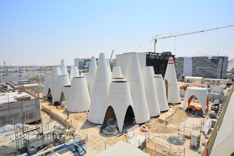 كان قد أقيم حفل وضع حجر أساس الجناح النمساوي في أكتوبر 2019 على قطعة أرض بمساحة 2400 متراً مربعاً، وارتفع أول مخروط في ربيع 2020 وهو واحد من 38 مخروطاً تشكل معاً الجناح المميز. ويبلغ قطر المخاريط عند القاعدة 7 أمتار، بينما تتفاوت ارتفاعاتها بين 6 و 15 متراً وهي تتشابك معاً لتوفر مساحات متسلسلة بأحجام متفاوتة. تم استخدام 246 من الأجزاء المسبقة الصنع في أعمال البناء وتم ربطها معاً باستخدام قارنات لتشكيل المخاريط الأمر الذي سيسهّل عملية تفكيك وإعادة بناء الجناح في موقع آخر عقب الانتهاء من استخدامه. وفي هذا الإطار، أوضحت المفوضة العامة بياتريكس: "ستستمر أعمال بناء المرحلة الثانية حتى بداية 2021. سيتم تركيب المعروضات والتجهيزات والمفروشات بوقت كاف قبل الافتتاح".