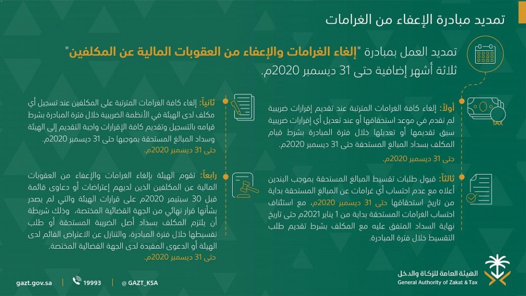 وتأتي مبادرة "إلغاء الغرامات والإعفاء من العقوبات المالية عن المكلفين" في إطار حزمة مبادرات تحفيز الاقتصاد ودعم القطاع الخاص، التي أطلقتها حكومة خادم الحرمين الشريفين في وقتٍ سابقٍ من هذا العام، لدعم القطاع الخاص في المملكة، وتمكينه من تجاوز الآثار المالية والاقتصادية الناتجة من انتشار جائحة كورونا (كوفيد-19)، والمحافظة على مشاركته الفَعّالة في تنمية الاقتصاد الوطني.