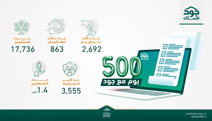 وأشاد معالي وزير الإسكان الأستاذ ماجد بن عبدالله الحقيل ، بما حققته جود الإسكان بالوصول إلى ما يتجاوز 1.4 مليون من المساهمين في منصة جود ، وذلك بعد 500 يوم من تدشين المنصة، مبدياً سعادته بما حققته منصة جود من دور مجتمعي وإنساني رائد من خلال دعم الأسر الأشد حاجة للمسكن ، مقدماً شكره باسم الأسر المستفيدة للمساهمين الداعمين كافة.