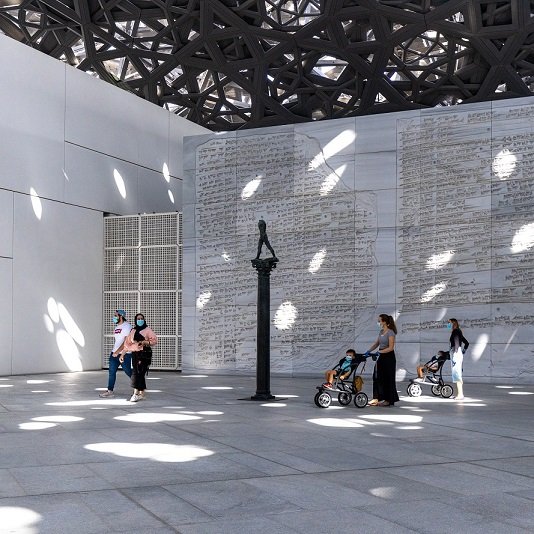 أتى متحف اللوفر أبوظبي ثمرة اتفاق استثنائي عُقد بين حكومتي أبوظبي وفرنسا، وقد عمل على تصميمه المهندس المعماري جان نوفيل، وفتح أبوابه أمام الجمهور في جزيرة السعديات في نوفمبر 2017. إن تصميم المتحف مستوحى من العمارة الإسلامية التقليدية، كما أن الضوء يتسلل من قبته الضخمة لينثر شعاع النور. وقد تحوّل المتحف، منذ عامه الأول، إلى مساحة اجتماعية فريدة تجمع الزوار في جو فني وثقافي.