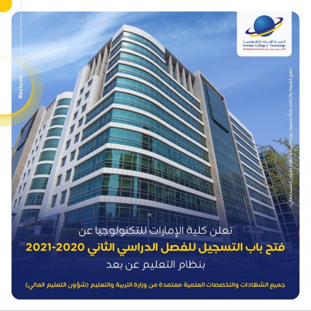 أعلنت كلية الإمارات للتكنولوجيا عن فتح باب التسجيل للفصل الدراسي الثاني 2020-2021 بنظام التعليم عن بعد ابتداءً من شهر نوفمبر الجاري.
