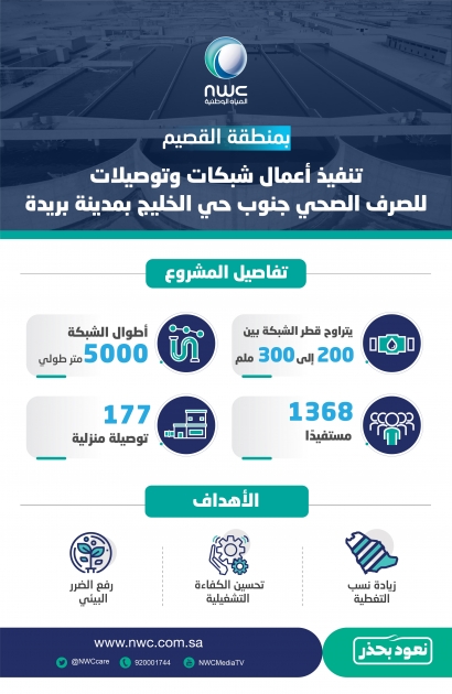 أعلنت شركة المياه الوطنية، ممثلة بالإدارة العامة لخدمات المياه بمنطقة القصيم الانتهاء من تنفيذ أعمال خط النقل الرئيسي والشبكات الداخلية والتوصيلات المنزلية للصرف الصحي جنوب حي الخليج بمدينة بريدة، وإدخالها حيز الخدمة، بهدف رفع الضرر البيئي عن سكان الحي. حيث استهدف المشروع خدمة أكثر من 1368 نسمة يسكنون في 177 عقارًا، وذلك من ضمن خططها لزيادة نسب التغطية، وتحسين الكفاءة التشغيلية للخدمات البيئية بمدينة بريدة من خلال إنشاء شبكات الصرف الصحي، والتوصيلات المنزلية بمدينة بريدة في منطقة القصيم.