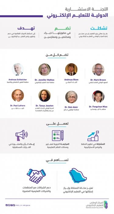 وتتمثل مهام اللجنة بإبداء الرأي والمشورة في القرارات والتوجهات الإستراتيجية والأفكار المستقبلية، وتقييمها وفقاً لأفضل الممارسات العالمية، والمراجعة الدورية لممارسات ومعايير التعليم الإلكتروني، ومراجعة نتائج الدراسات والتقارير الدورية، وتقديم توصيات لتطوير ممارسات التعليم الإلكتروني في المملكة، إلى جانب دعم الشراكات مع المنظمات والشركات التعليمية المتميزة عالمياً، ودعم مكانة وحضور المملكة وإبراز إنجازاتها في التعليم الإلكتروني.