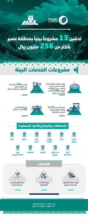 أما عن دعم الاستدامة البيئية في منطقة عسير فقد بلغت المشاريع البيئية التي دشنها سمو أمير منطقة عسير 13 مشروعًا، نفذت بتكلفة تجاوزت 256 مليون ريال، بهدف زيادة نسبة التغطية بالخدمات البيئية في المنطقة من خلال تنفيذ ما يزيد على 296 كيلو مترًا من خطوط النقل والشبكات ومحطات الرفع، وأكثر من 5,510 توصيلة منزلية للصرف الصحي بالمنطقة لخدمة أكثر من 360 ألف مستفيد جديد، لتصل بذلك نسبة التغطية بالخدمات البيئية إلى قرابة (74,24%)، فضلًا عن رفع الضرر البيئي عن عدد من أحياء مدينة أبها ومحافظات المنطقة ومراكزها، أبرزها أحياء النمصا الجنوبية، والقريقر، والمشارف، وغرب طريق المطار، ومحافظة خميس مشيط، وبيشة، وظهران الجنوب، ومحايل، وسراة عبيدة، ومركز البرك، بالإضافة إلى محطة لمعالجة مياه الصرف الصحي بمركز الشعف، بسعة معالجة يومية تبلغ 12,500 متر مكعب في اليوم.