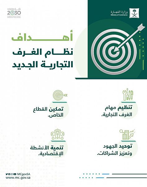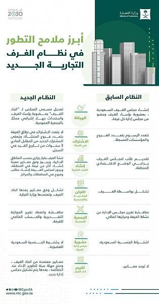 وبينت الوزارة أن النظام يوحد الجهود لخدمة القطاع الخاص من خلال إنشاء وإعادة تشكيل الغرف التجارية بحسب المناطق الإدارية، ويُمكن من إنشاء أكثر من غرفة تجارية في المنطقة الواحدة، أو مكاتب أو فروع في المحافظات والمراكز التابعة لها، إضافة إلى تمكين المستثمر الأجنبي من عضوية مجالس إدارات الغرف التجارية لأول مرة بعد إلغاء اشتراط الجنسية السعودية لعضويتها، على أن تُجدد عضوية مجلس الإدارة لدورتين متتاليتين فقط.