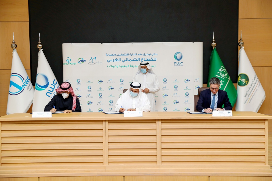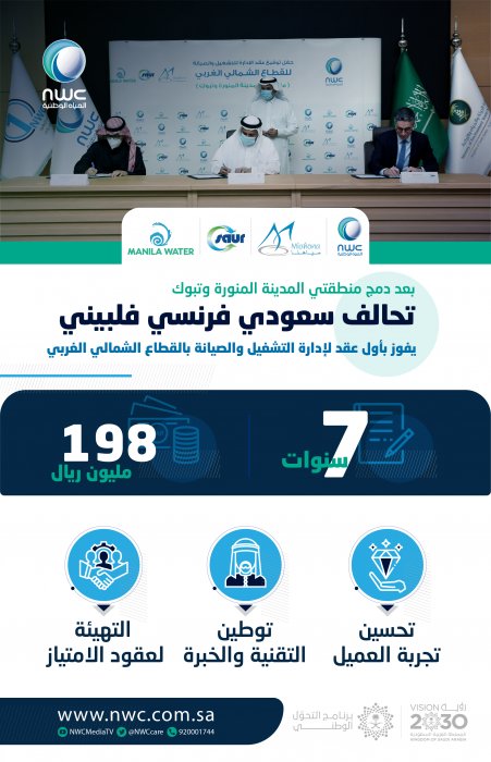 أعلنت شركة المياه الوطنية، اليوم توقيعها أول عقد إدارة مع القطاع الخاص ليتولى من خلاله تشغيل خدمات المياه والمعالجة البيئية في القطاع الشمالي الغربي الذي يضم منطقتي المدينة المنورة وتبوك، الذي تم دمجه تحت مظلة الشركة، مع تحالف سعودي فرنسي فليبيني بتكلفة تجاوزت 198 مليون ريال (52.5 مليون دولار)، لمدة سبع سنوات.