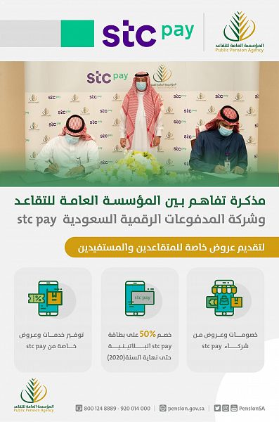 وقعت المؤسسة العامة للتقاعد وشركة المدفوعات الرقمية السعودية stc pay في مقر المؤسسة, مذكرة تفاهم لتقديم مزايا وخصومات خاصة للمتقاعدين والمستفيدين في جميع مناطق المملكة من خلال الدفع عبر محفظة stc pay.