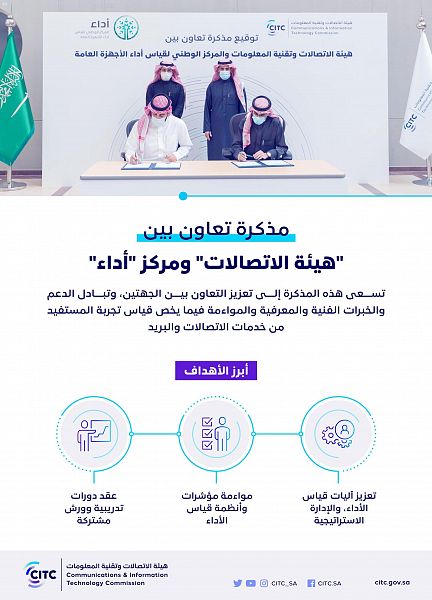 وقّعت هيئة الاتصالات وتقنية المعلومات، مذكرة تعاون مع المركز الوطني لقياس أداء الأجهزة العامة "أداء"؛ لتبادل الدعم والخبرات الفنية والمعرفية في المجالات ذات الاهتمام المشترك بين الطرفين.