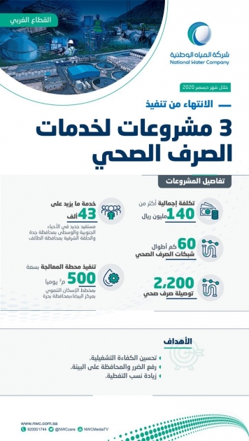 انتهى القطاع الغربي بشركة المياه الوطنية من تنفيذ (3) مشروعات لخدمات الصرف الصحي خلال شهر ديسمبر الماضي بتكلفة تجاوزت (140) مليون ريال، وذلك لخدمة ما يزيد على (43) ألف مستفيد في الأحياء الجنوبية والوسطى بمحافظة جدة، والحلقة الشرقية بمحافظة الطائف، ومحافظة بحرة.