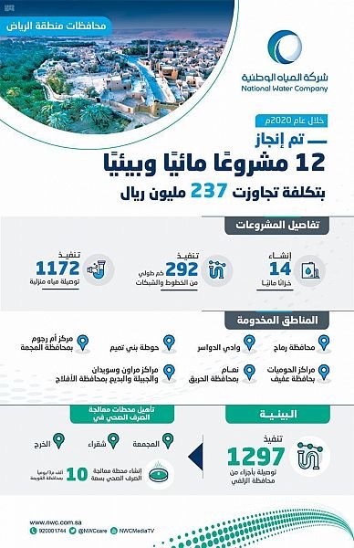 ولفتت المياه الوطنية النظر إلى أن محافظات منطقة الرياض شهدت الانتهاء من العديد من مشروعات المياه، تمثلت في إنشاء وتشيّيد عدد (14) خزانًا مائيًا، وتنفيذ خطوط وشبكات بلغت أطوالها (292) كيلومترًا طوليًا، بالإضافة إلى تنفيذ ما يقارب (1172) توصيلة مياه منزلية لخدمة أجزاء من محافظات رماح، ووادي الدواسر، وحوطة بني تميم، وأجزاء من مراكز البديع والحوميات، وأم رجوم، ونعام، والجبيلة، ومركزي مراون وسويدان، وكذلك تنفيذ عدد من مشروعات الخدمات البيئية في محافظات منطقة الرياض تشمل إنشاء وإعادة تأهيل محطات صرف صحي في كل من المجمعة والخرج وشقراء والقويعية، بالإضافة إلى تنفيذ (1297) توصيلة صرف صحي منزلية لخدمة أجزاء من محافظة الزلفي .
