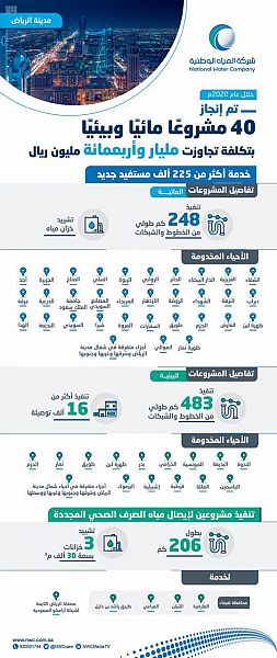 وأوضحت شركة المياه الوطنية أن عدد المشروعات التي نُفذت في مدينة الرياض ومحافظاتها بلغ (52) مشروعًا مائيًا وبيئيًا، بتكلفة مالية تجاوزت مليارًا وست مائة مليون ريال، وذلك لخدمة ما يقارب (225) ألف مستفيد جديد".