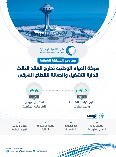 طرحت شركة المياه الوطنية اليوم الأحد 21 مارس 2021 كراسة الشروط والمواصفات للتحالفات المحلية والعالمية لعقد إدارة التشغيل والصيانة للقطاع الشرقي، إذ يُعد ثالث عقود الإدارة التي تطرحها للتحالفات المؤهلة مسبقًا التي تضم شركات محلية وعالمية.