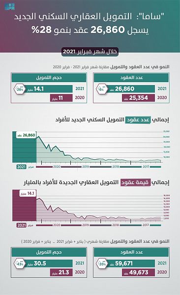 حقق التمويل العقاري السكني الجديد للأفراد خلال شهر فبراير الماضي من العام 2021 نمواً 28% بقيمة تجاوزت 14 مليار ريال، مقارنة بشهر فبراير 2020، كما سجلت عقود التمويل العقاري نحو 26,860 عقداً بنمو سنوي 6%، بحسب النشرة الإحصائية الشهرية الصادرة عن البنك المركزي السعودي "ساما"، إذ سجّل شهر فبراير 2020 نحو 25 ألف عقد تمويل عقاري بقيمة 11 مليار.