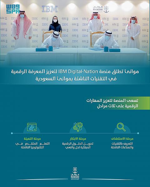أعلنت الهيئة العامة للموانئ "موانئ" عن تعاونها مع شركة "أي بي إم"، لإطلاق برنامج تجريبي يقدم منصة (IBM Digital-Nation) لموظفيها في جميع أنحاء المملكة ،التي تعدّ نظاماً أساسياً للتعلم والابتكار عبر "الإنترنت" وذلك تماشياً مع مستهدفات رؤية المملكة 2030 ؛لتعزيز الثقافة الرقمية والاقتصاد الوطني.