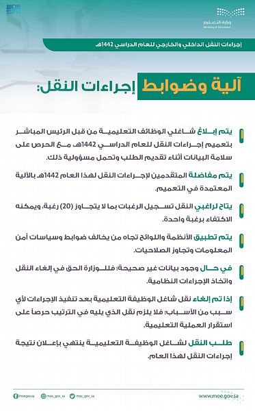 وأكدت وزارة التعليم أن طلب النقل لشاغل الوظيفة التعليمية ينتهي بإعلان نتيجة إجراءات النقل لهذا العام، مشيرةً إلى أنه سيتم تطبيق الأنظمة واللوائح تجاه مَنْ يخالف ضوابط وسياسات أمن المعلومات وتجاوز الصلاحيات، وفي حال وجود بيانات غير صحيحة؛ فإن للوزارة الحق في إلغاء عملية النقل، مبينةً أنه إذا تم إلغاء نقل شاغل الوظيفة التعليمية بعد تنفيذ الإجراءات لأي سبب فلا يلزم نقل الذي يليه في الترتيب حرصاً على استقرار العملية التعليمية.