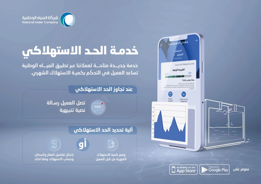 ويتضمن التطبيق خدمة الحد الاستهلاكي التي وعدت بها شركة المياه الوطنية عملائها في وقت سابق لمساعدتهم على التحكم في استهلاكهم، ويضع التطبيق حداً مبدئياً، يستطيع العملاء تغييره من خلال الدخول إلى التطبيق، إما مباشرة عبر وضع حد معين، أو الاستفادة من الذكاء الاصطناعي، والإجابة على مجموعة أسئلة تساعد التطبيق على صناعة حد مخصص للعميل بناء على تفاصيل عقاره، وعدد السكان ومساحة الحديقة، وعدد الأشجار الكبيرة، لتصل للعميل رسائل نصية تنبيهية في حال تجاوزه الحد الاستهلاكي.