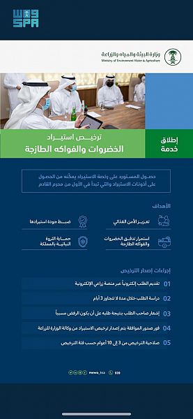أطلقت وزارة البيئة والمياه والزراعة خدمة ترخيص استيراد الخضروات والفواكه الطازجة، بهدف استمرار تدفق الخضروات والفواكه الطازجة لتعزيز الأمن الغذائي، وضبط جودة استيرادها، وحماية الثروة النباتية بالمملكة.