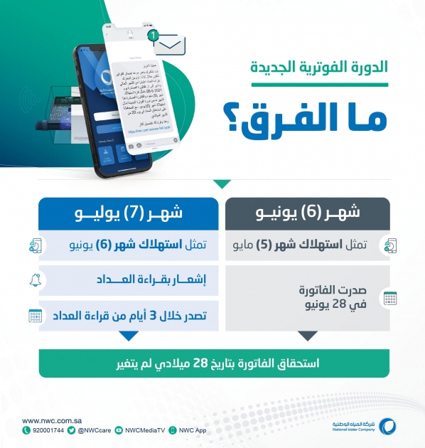 نجحت شركة المياه الوطنية في الأسبوع الأول من الشهر الجاري، في إصدار أكثر من 500 ألف فاتورة عن شهر يونيو بانسيابية لعملائها، خلال ثلاثة أيام من إشعارهم بقراءات عداداتهم ضمن الدورة الفوترية الجديدة التي أعلنت عنها الشهر الماضي.
