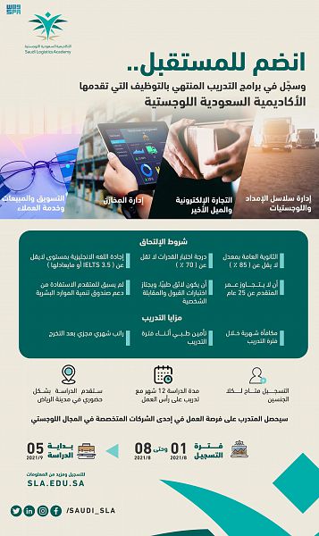 ودعت الأكاديمية السعودية اللوجستية الراغبين في الالتحاق بالمرحلة الأولى من البرامج التدريبية إلى المبادرة بالتسجيل من خلال زيارة موقعها الإلكتروني على الإنترنت: (SLA.EDU.SA) والاطلاع على شروط التسجيل وتفاصيل البرامج التدريبية، وسيتاح التسجيل بدءاً من اليوم وحتى يوم الأحد القادم 29 ذو الحجة 1442هـ الموافق 8 أغسطس 2021م.
