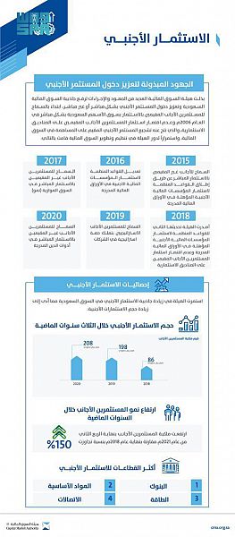 ونتيجة لهذه الجهود ارتفعت قيمة ملكية المستثمرين الأجانب في السوق المالية السعودية بنسبة تجاوزت 150% بنهاية الربع الثاني من عام 2021م مقارنة بنهاية عام 2018م، كما حققت قطاعات البنوك والمواد الأساسية والطاقة والاتصالات أكثر القطاعات للاستثمار الأجنبي.