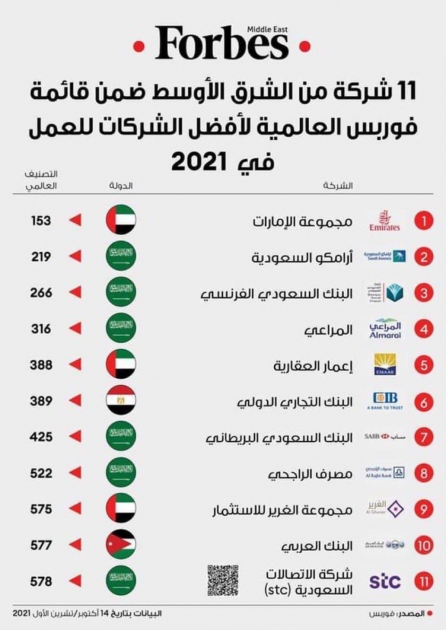 وتصدر فوربس سنويًا بالشراكة مع شركة أبحاث السوق "ستاتيستا" قائمتها لأفضل جهات التوظيف في العالم من خلال مسح 150 ألف عامل بدوام كامل وبدوام جزئي في شركات ومؤسسات متعددة الجنسيات من 58 دولة.