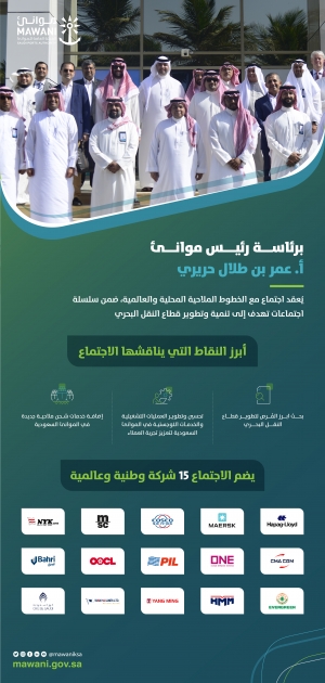 عقدت الهيئة العامة للموانئ "موانئ" لقاءً مع الخطوط الملاحية برئاسة سعادة رئيس الهيئة الأستاذ عمر بن طلال حريري، وبمشاركة 15 شركة من الخطوط الملاحية محلياً وعالمياً وذلك ضمن سلسلة من الاجتماعات الدورية المستمرة، بما يحقق مستهدفات قطاع النقل البحري المتوائمة مع الاستراتيجية الوطنية للنقل والخدمات اللوجستية.