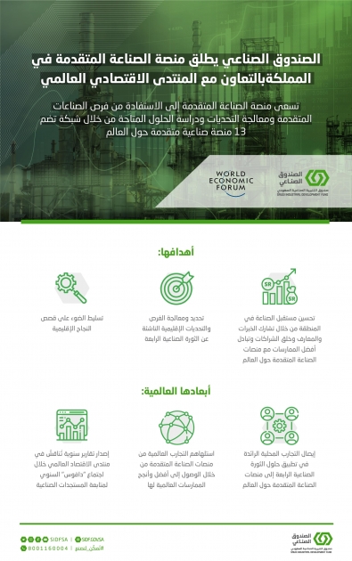 أطلق صندوق التنمية الصناعية السعودي بالتعاون مع المنتدى الاقتصادي العالمي "World Economic Forum"منصة الصناعة المتقدمة في المملكة، والتي تضم أعضاء من القطاعين العام والخاص، ورجال أعمال، وأصحاب مشاريع صغيرة ومتوسطة، بالإضافة إلى نخبة مميزة من المؤسسات الأكاديمية؛ لتتولى دراسة الفرص والتحديات التي تواجه القطاعات الصناعية.