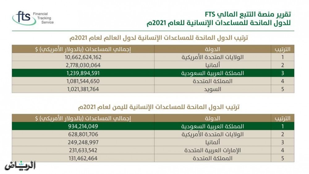 يذكر أن تقرير منصة التتبع المالي التابعة للأمم المتحدة (FTS) للعام 2021م كشف أن المملكة حصلت على المرتبة الثالثة عالميًا بعد الولايات المتحدة الأمريكية وألمانيا في حجم المساعدات الإنسانية المقدمة لدول العالم بمبلغ مليار و239 مليونًا و894 ألفًا و591 دولارًا أمريكيًا، والمرتبة الأولى عالميًا كأكبر المانحين لليمن بمبلغ 934 مليونًا و214 ألفًا و49 دولارًا أمريكيًا.