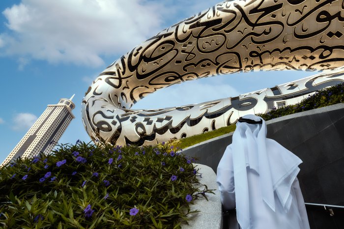 وانشغلت عدسات المصورين المحترفين خارج المتحف، الذي يعد المبنى الأكثر انسيابية وإبداعاً على النحو الذي جعل منه أيقونة معمارية وحضارية عالمية، بالتقاط صور إبداعية مدهشة لمقولات صاحب السموّ الشيخ محمد بن راشد آل مكتوم، نائب رئيس الدولة، رئيس مجلس الوزراء، حاكم دبي، "رعاه الله" التي تزدان بها واجهته، والمكتوبة بخط الثلث العربي لتشكل ظاهرة فنية فريدة، تبرز المقومات الجمالية لفن الخط العربي من جهة، وتكشف جانباً من رسالة هذا المعلم العالمي من جهة أخرى.
