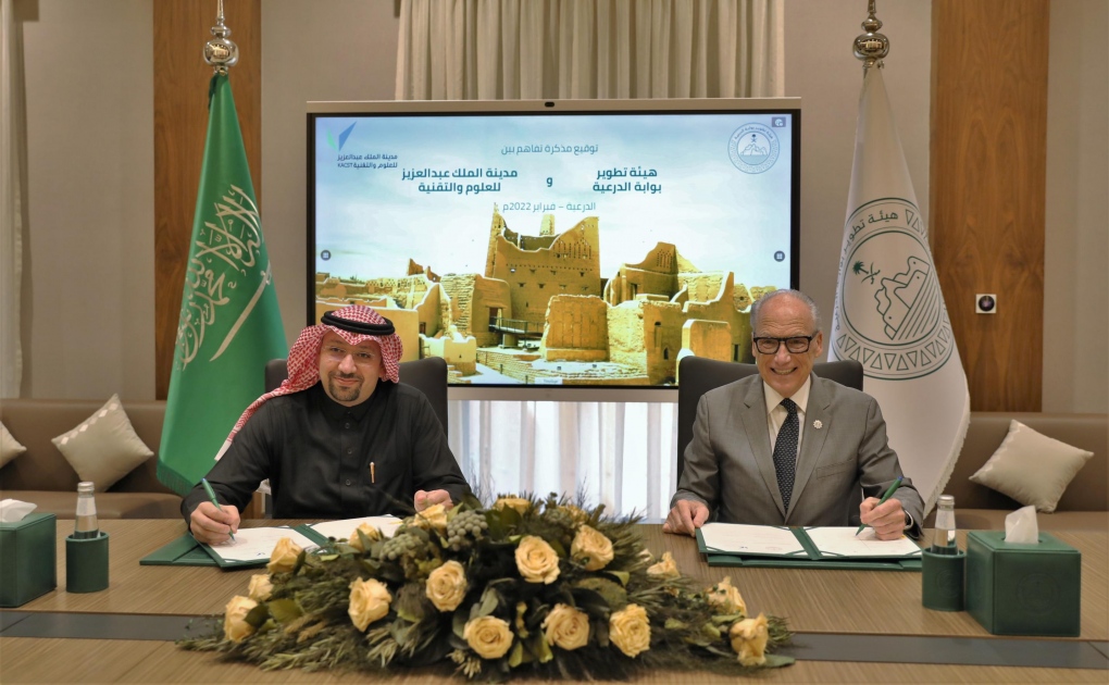 ووقع مذكرة التفاهم معالي رئيس مدينة الملك عبدالعزيز للعلوم والتقنية الدكتور منير بن محمود الدسوقي، والرئيس التنفيذي لهيئة تطوير بوابة الدرعية السيد جيري إنزيريلو، حيث تشمل هذه الاتفاقية مجالات التعاون في حوكمة البيانات وتبادل المعلومات ذات الاهتمام المشترك، وتبادل المعرفة والخبرات والاستشارات الفنية في المجالات المشتركة، ودعم الأنشطة البحثية بين الطرفين، والشراكة في دعم الجهود التعريفية بمنتجات كلا الطرفين، والتعاون في مجال أعمال الصور الفضائية والتصوير البصري ثلاثي الأبعاد والمسح الراداري للكشف عن الآثار المدفونة، إلى جانب التعاون في مجال تقنيات المواد المتقدمة ونظم البناء المؤتمته، بما يساعد هيئة تطوير بوابة الدرعية على القيام بدورها ضمن نطاقها الإشرافي.