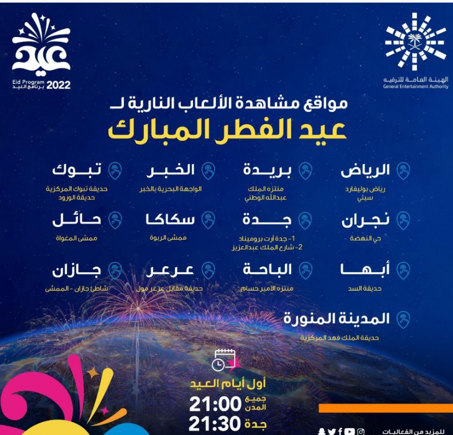 تعانق سماء المملكة في مساء أول أيام عيد الفطر مجموعة من الألعاب النارية التي تشكل إحدى فعاليات الهيئة العامة للترفيه في برنامجها لعيد هذا العام 2022، حيث تضيء الألعاب بوهجها وألوانها جميع مناطق المملكة، لتضاعف مستويات الفرح، وتهيئ لانطلاق بقية الفعاليات المتنوعة التي تصاحب سكان المملكة خلال أيام عيد الفطر.