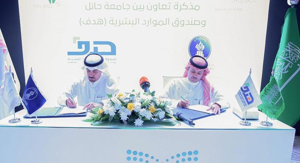أبرم صندوق تنمية الموارد البشرية (هدف) وجامعة حائل مذكرة تعاون، لدعم تدريب وتأهيل وتوظيف طلبة الجامعة وضمان مواءمة مهاراتهم وكفاءاتهم المهنية للاحتياجات الفعلية لسوق العمل، من خلال الاستفادة من برامج وممكنات الصندوق في التوجيه والإرشاد المهني (سُبل) وبرنامج التدريب على رأس العمل (تمهير) والمنصة الوطنية للتدريب الإلكتروني "دروب"، بالإضافة إلى إتاحة بيانات الجامعة للمرصد الوطني للعمل على معالجتها وربطها مع بيانات سوق العمل.