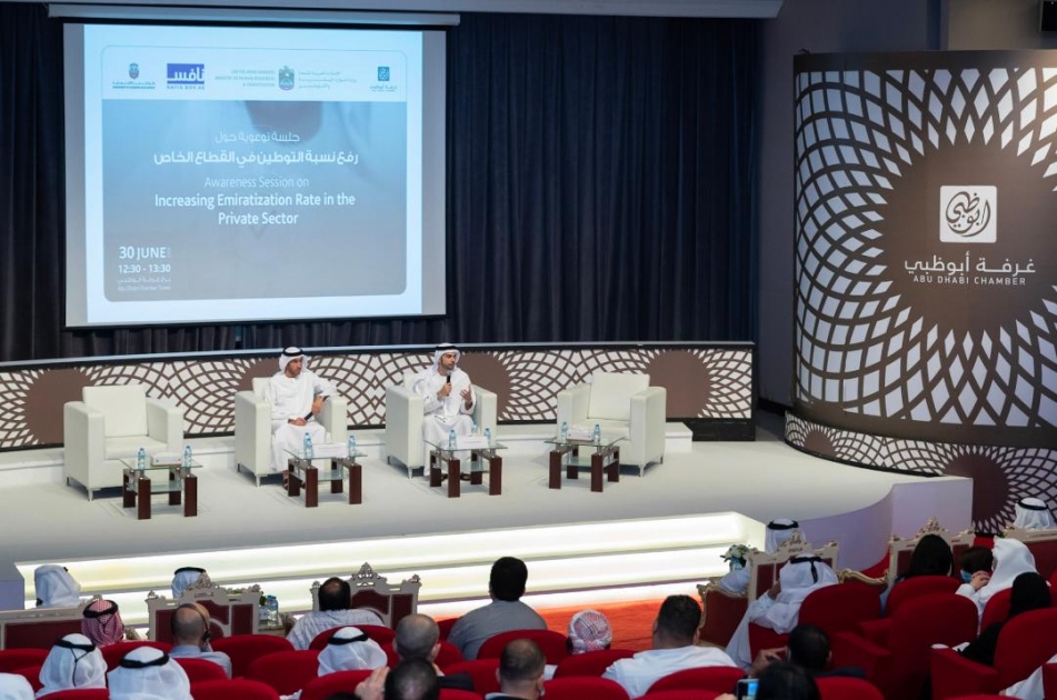 سلطت جلسة توعوية نظمتها غرفة تجارة وصناعة أبوظبي بالتعاون مع دائرة التنمية الاقتصادية بأبوظبي ومجلس تنافسية الكوادر الوطنية "نافس" ووزارة الموارد البشرية والتوطين، الضوء على جهود الإمارات لرفع نسبة التوطين في القطاع الخاص.
